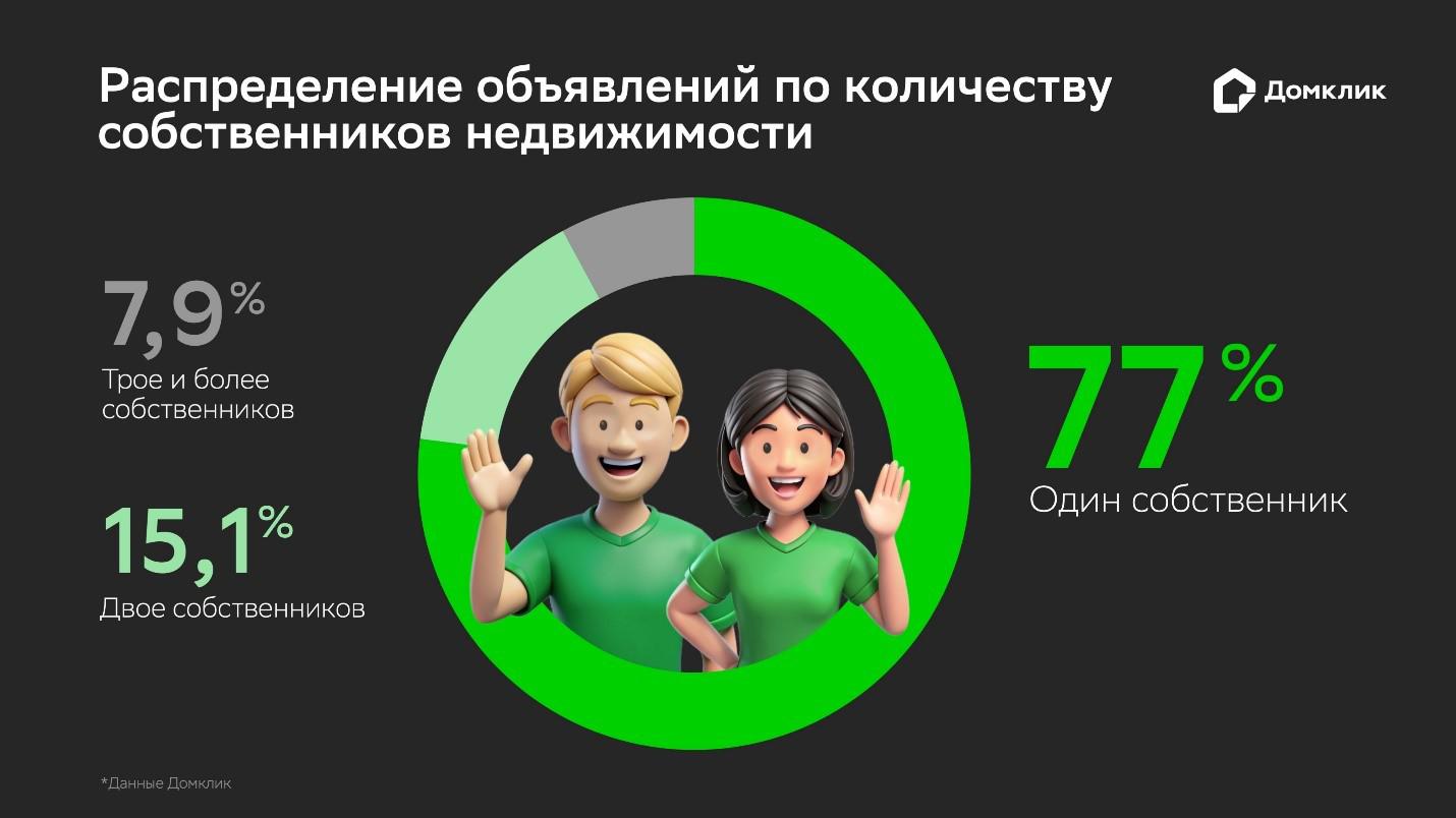 Что касается структуры собственников, статистика витрины показывает, что 77% вторичного жилья принадлежит единственному владельцу, еще 15,1% — двоим. «Зачастую это объекты в собственности семей, в том числе купленные в ипотеку или доставшиеся по наследству детям из одной семьи», — указывается в материале. Еще 7,9% квартир находятся в собственности сразу у троих и более человек. В основном, рассказывают эксперты, это доли, перешедшие в наследство, либо жилье, в котором при покупке были выделены доли несовершеннолетним детям.