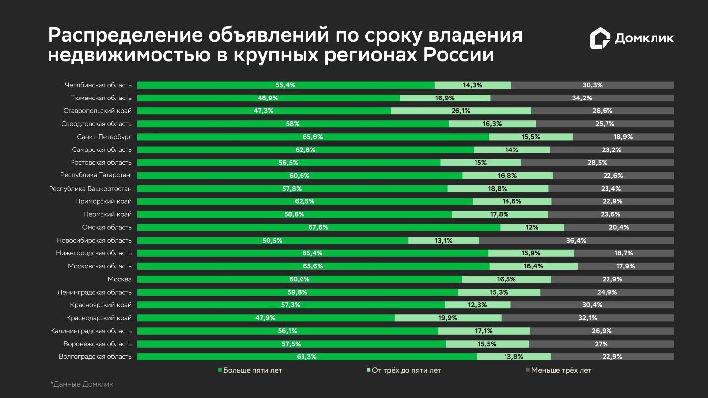 Отдельно в «Домклик» изучили региональную специфику, проанализировав предложение по крупнейшим субъектам. Так, по данным витрины, Омская область лидирует по доле объявлений о продаже вторички, которая в собственности более пяти лет — там их 67,6%. Меньше всего таких объявлений в Краснодарском крае — 47,9%.