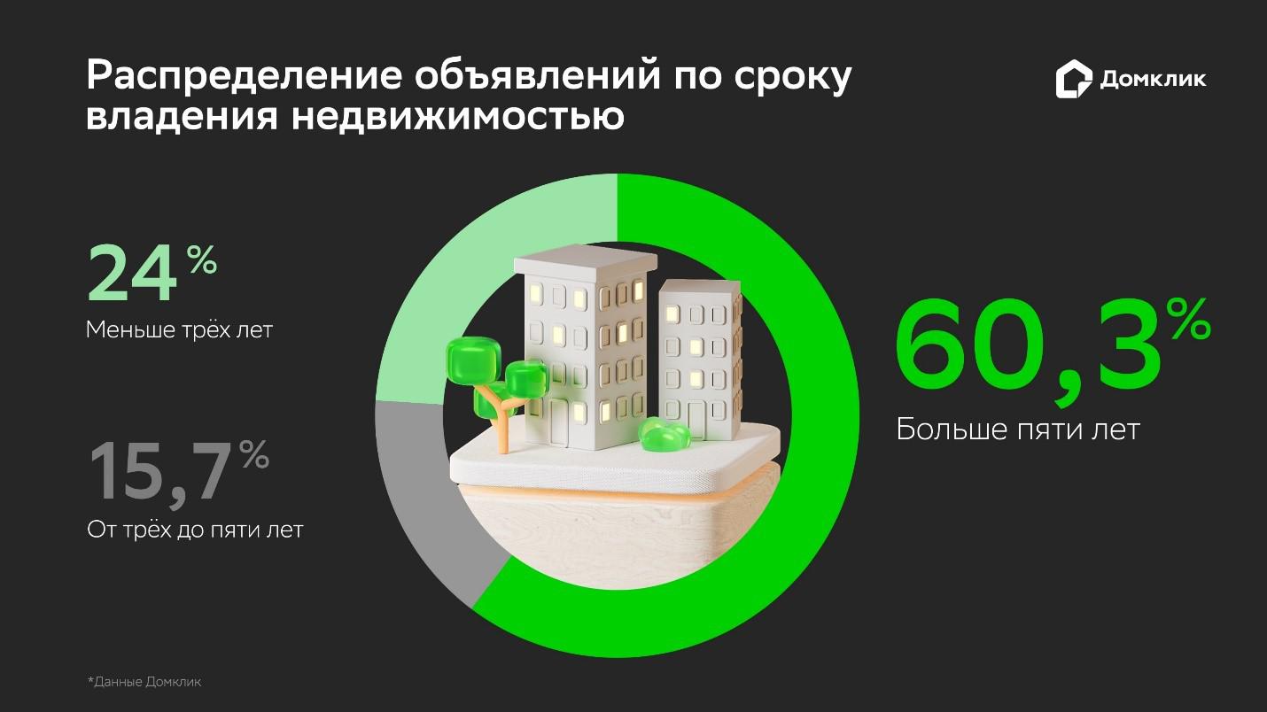 По статистике витрины, такой срок владения в собственности отмечается по 60,3% объявлений, причем за год показатель увеличился на 0,9 п.п.