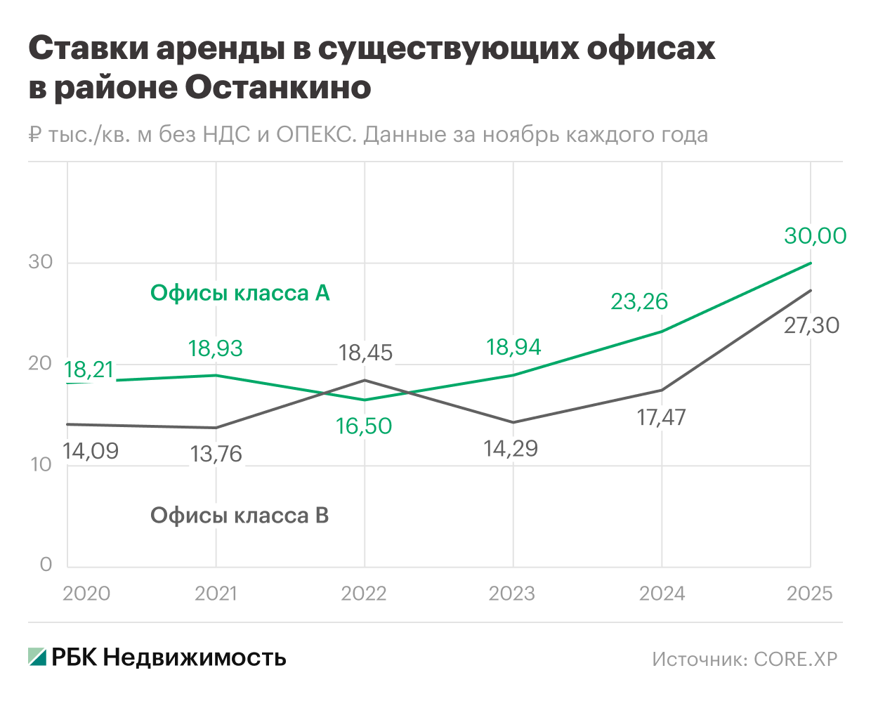 По состоянию на конец осени 2025 года уровень офисной вакантности в Останкинском районе чуть выше среднего по Москве: 6% против 4%, говорит старший директор, руководитель департамента офисной недвижимости Core.XP Ирина Хорошилова. «Средняя ставка аренды на офисы класса А в районе составляет сейчас 30 тыс. руб. за 1 кв. м в год (без НДС, операционных и коммунальных расходов), а для класса B — 27,3 тыс. руб. за 1 кв. м», — добавляет она.