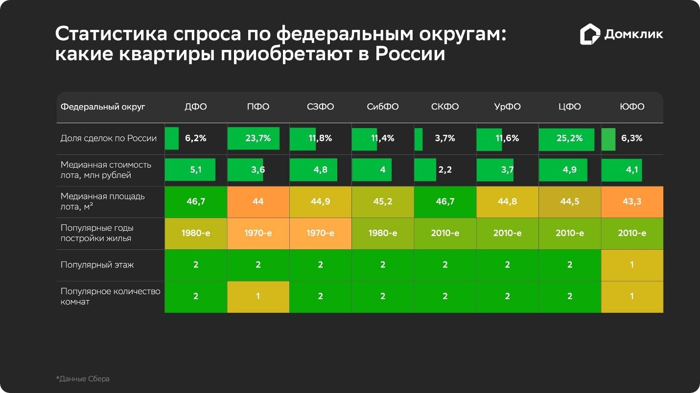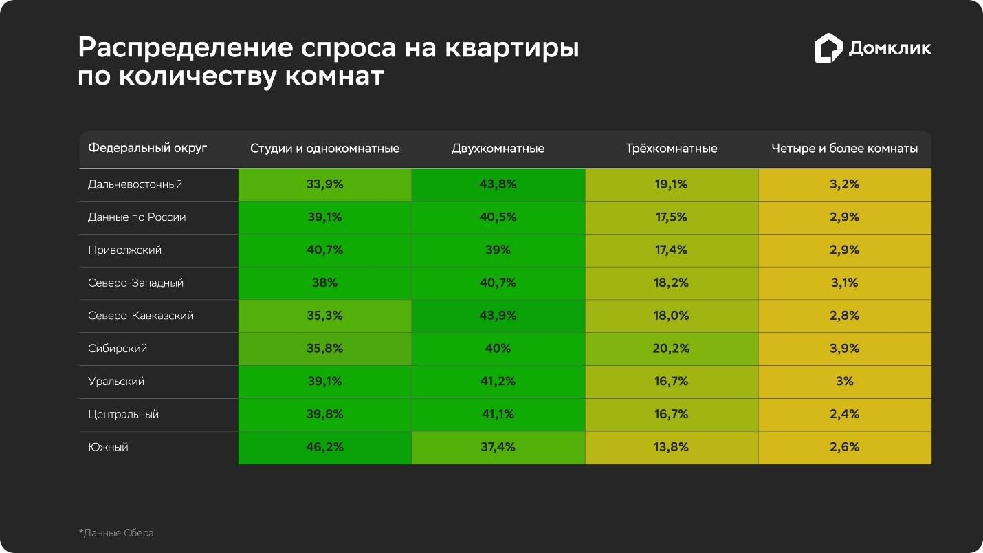 Максимальная доля однушек отмечена в Южном (46,2%), Приволжском (40,7%) и Центральном (39,8%) ФО, двушек — в Северо-Кавказском (43,9%), Дальневосточном (43,8%) и Уральском (41,2%) ФО. Лидером по доле сделок с трехкомнатными квартирами стал Сибирский федеральный округ с показателем 20,2% покупок. В этом же округе отмечена и максимальная доля сделок с лотами от четырех комнат и более (3,9%). Относительно высокие показатели по спросу на многокомнатное жилье также в Северо-Западном и Дальневосточном округах.