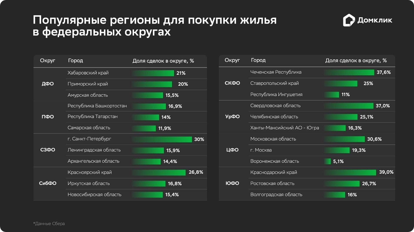 В исследовании также были рассмотрены самые востребованные регионы для покупки вторичного жилья в рамках каждого федерального округа. В Центральном ФО первую тройку составили, например, Московская область, Москва и Воронежская область.