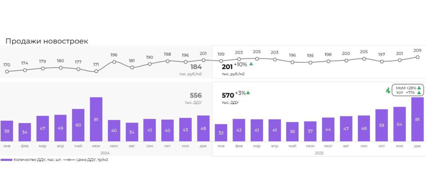 Рост стал возможен благодаря увеличению активности на рынке в конце года на фоне предстоящего изменения условий предоставления семейной ипотеки. В декабре было заключено 81,5 тыс. ДДУ, что стало рекордом как за 2025-й (+71% год к году, +28% к ноябрю), так и за 2024 год. Доля ипотеки в последнем месяце года также достигла максимальных показателей: 77% всех квартир в новостройках приобретались с использованием этого кредитного инструмента, говорится в исследовании.