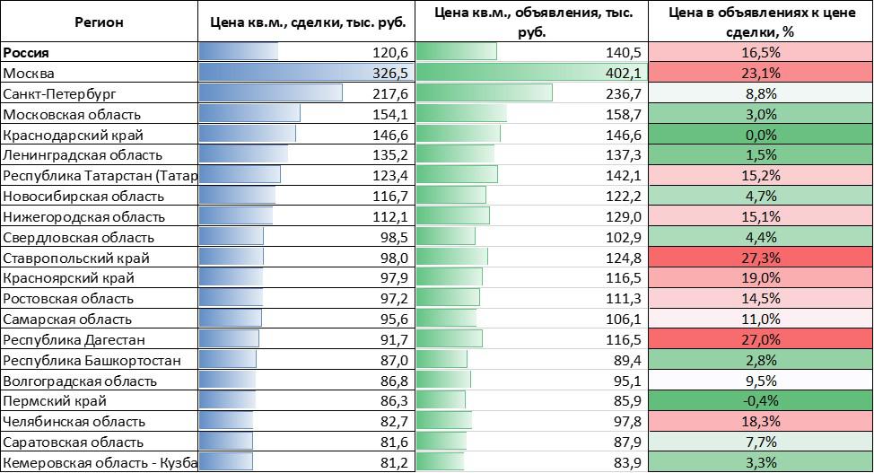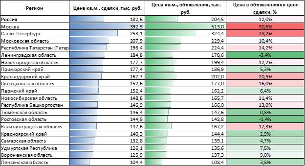 Сравнение данных «СберИндекса» и «Домклик» показало, что в декабре различие между ценой первичного «квадрата» в объявлениях и сделках увеличилось на 0,2 п.п. и составило 12%. Самые существенные значения этого показателя — в Москве (30,6%), Санкт-Петербурге (28,2%) и Краснодарском крае (20,5%), уточнили аналитики.