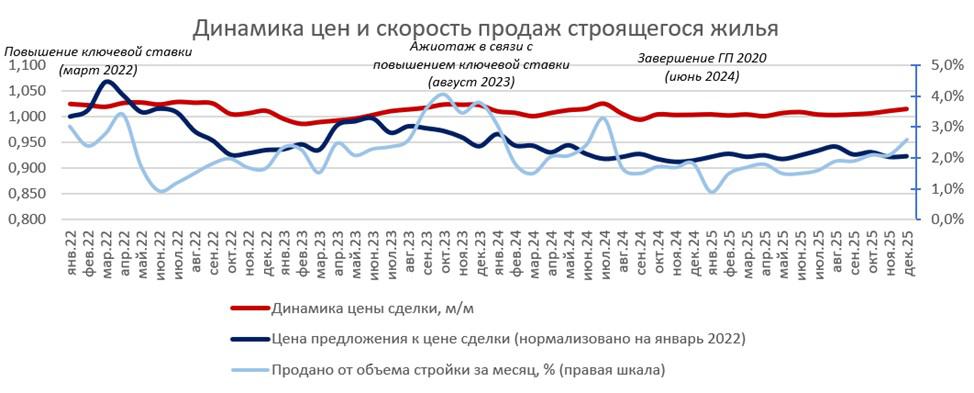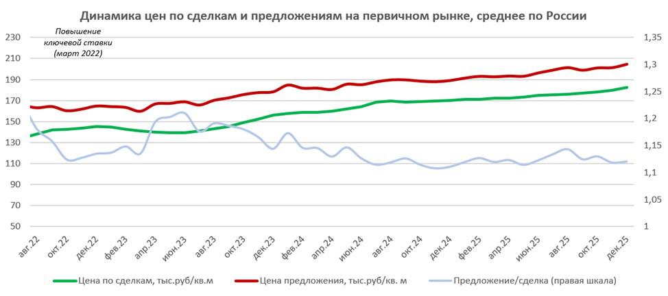 При этом готовые квартиры в современных домах в 2025 году обогнали по росту цен первичный рынок, обращают внимание эксперты. «Цены на вторичку в домах, построенных за последние десять лет, выросли за год на 12%», — подчеркивается в исследовании. Ценовой разрыв между первичным жильем и «новой вторичкой» по итогам декабря составил 7,2%.