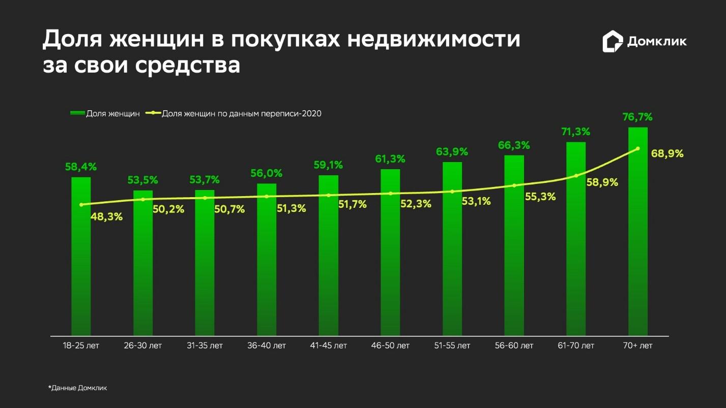 В исследовании указывается, что женщины в среднем чаще мужчин приобретают жилье без привлечения ипотеки — соотношение составляет 61,5% к 38,5%. В структуре ипотечных сделок соотношение иное: 52,4% спроса приходится на женщин и 47,6% — на мужчин.