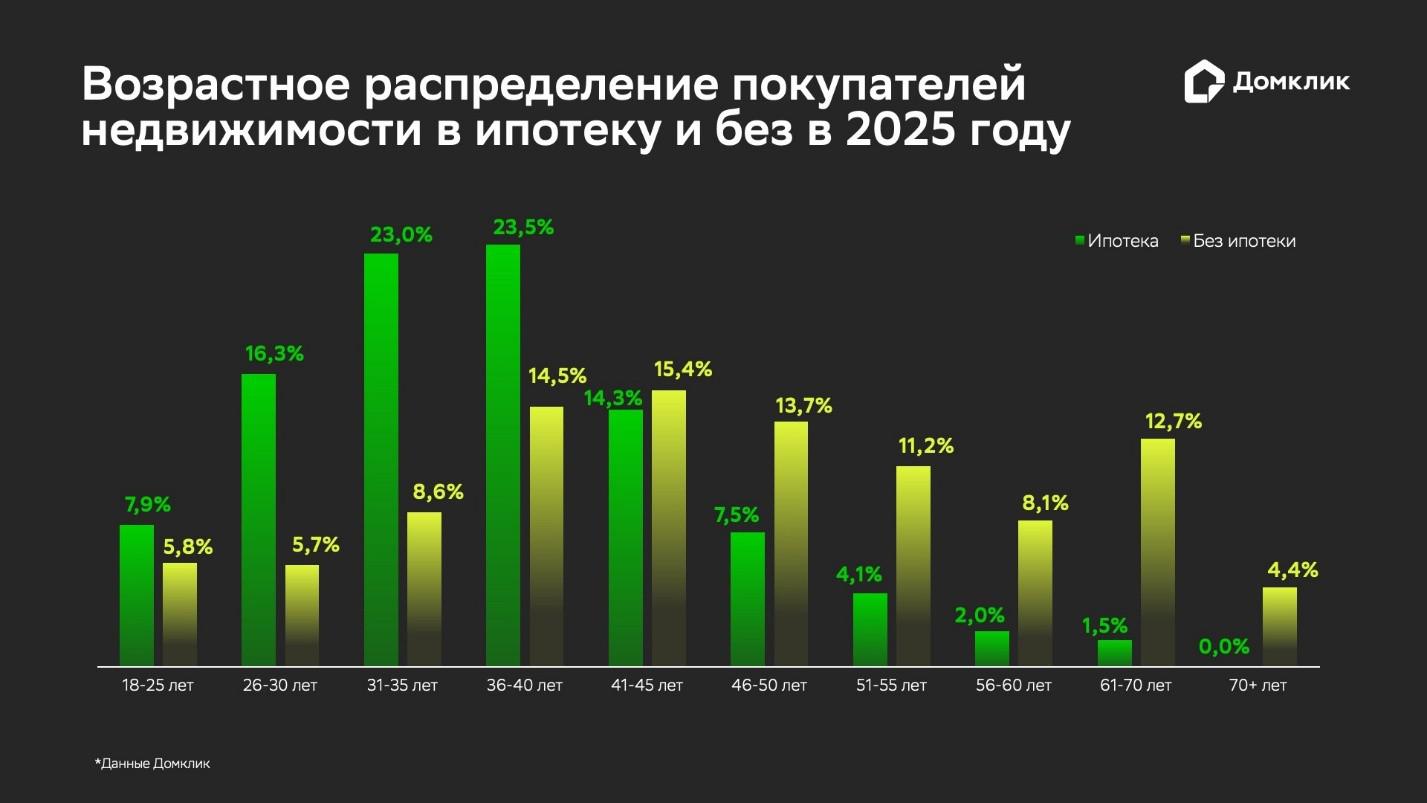 Средний возраст покупателей жилья, которые совершают сделку без привлечения жилищного кредита, выше, чем у покупателей-ипотечников, следует из поступившего в редакцию исследования аналитиков «Домклик».