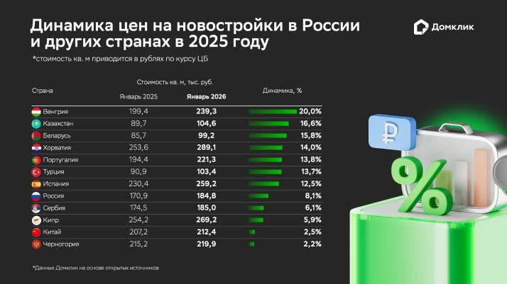 По итогам 2025 года Россия заняла четвертое место в рейтинге стран по росту цен на вторичное жилье (+8,7%), и восьмое — на новостройки (+8,1%), следует из поступившего в редакцию исследования аналитиков «Домклик». При этом максимальный рост цен на новостройки за год был отмечен в Венгрии (+20%), Казахстане (+16,6%) и Беларуси (+15,8%), на вторичку — в Португалии (+18,8%), Казахстане (+13,6%) и Венгрии (+12,2%).