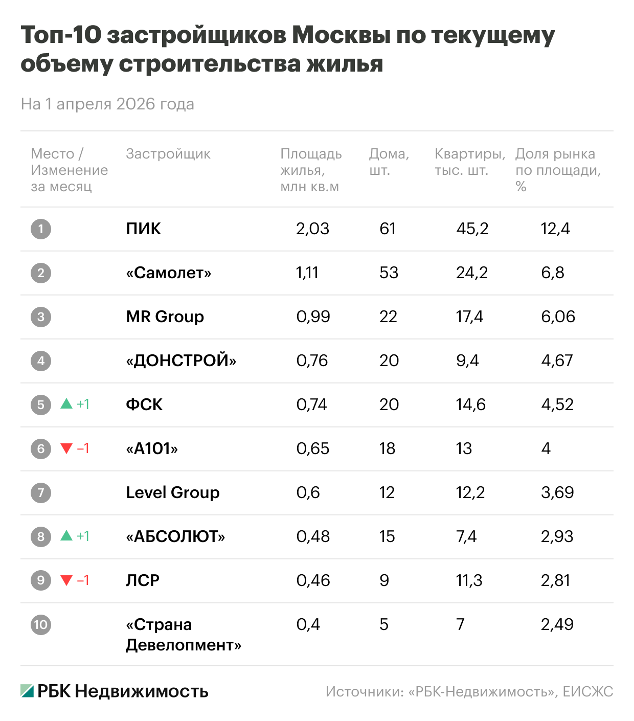В рейтинге девелоперов учитываются возводимые жилые дома и комплексы апартаментов из проектных деклараций, опубликованных в ЕИСЖС на 1 апреля 2026 года. Рейтинг «РБК Недвижимости» «Топ-10 застройщиков Москвы» публикуется регулярно в начале каждого месяца.