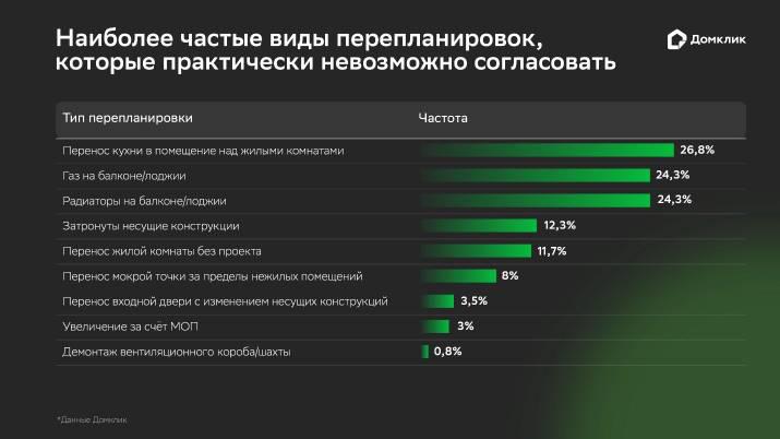 В исследовании указывается, что большинство выявленных перепланировок (93,7%) могут быть узаконены, однако 6,3% легализовать не получится. Из этого объема почти половины (48,6%) — перенос на балкон или лоджию газового оборудования или радиаторов отопления. Еще 12,3% приходится на изменения плана квартиры за счет несущих конструкций, 8% — на перенос «мокрых точек» в помещения, под которыми расположены жилые комнаты соседей. В числе перепланировок без возможности легализации — также изменение входного дверного проема (3,5%), увеличение площади квартиры за счет мест общего пользования (3%) и демонтаж вентиляционного короба (0,8%).